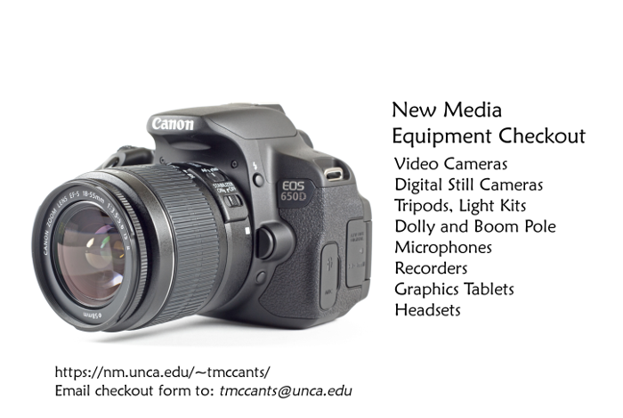 If the New Media Department doesn't have the type of equipment you need, try going to Ramsey Library. They also loan out specialty video and computer equipment.