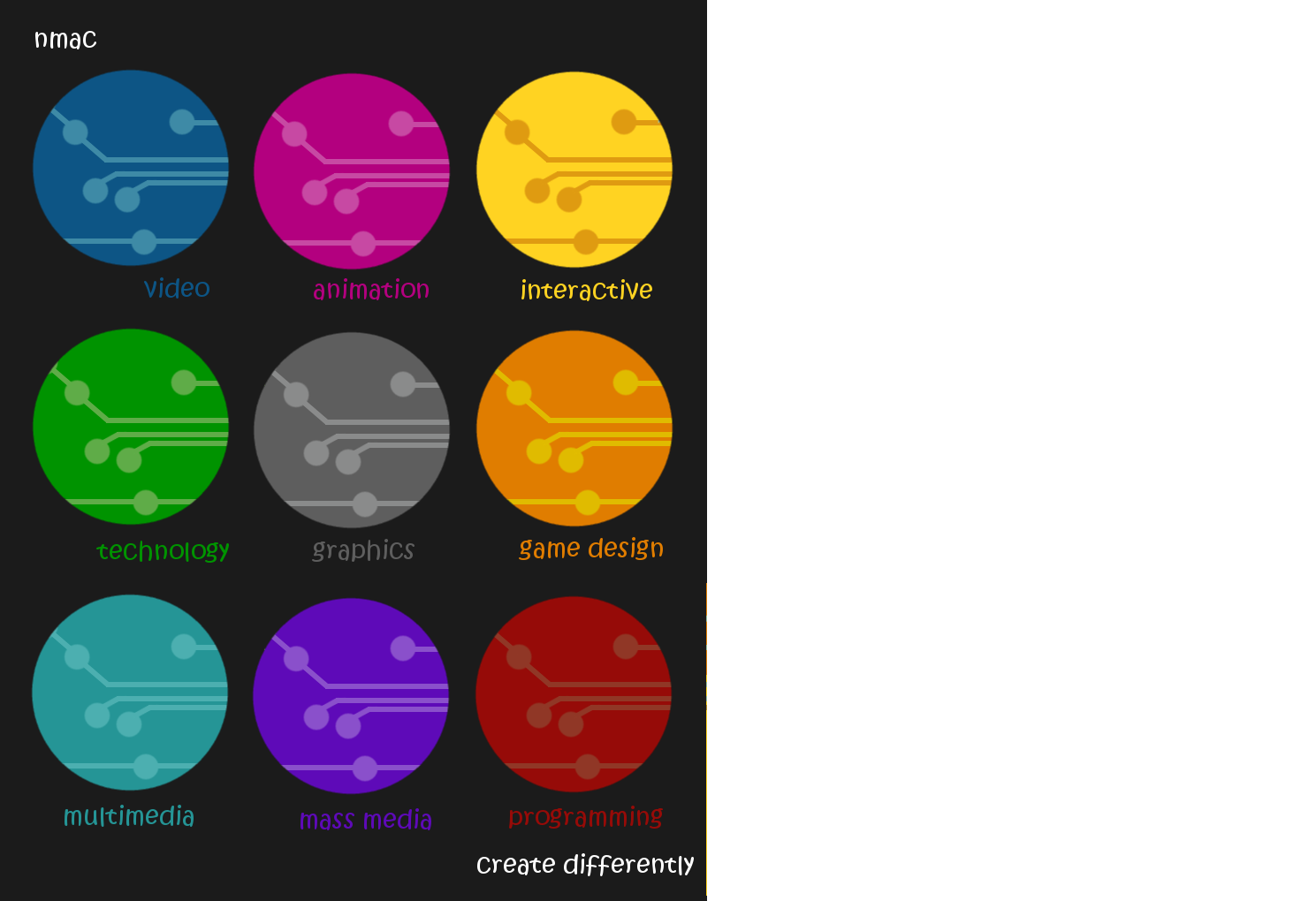 Currently it is very difficult to find ways to meet everyone in this department's wildly different design tastes. Restructuring NewMAC's organization into distinct themed divisions would extend our ability to provide resources evenly to all interest areas, as well as to provide opportunities for collaborative group projects that are not limited by term length. Here are some possibilities for these teams.