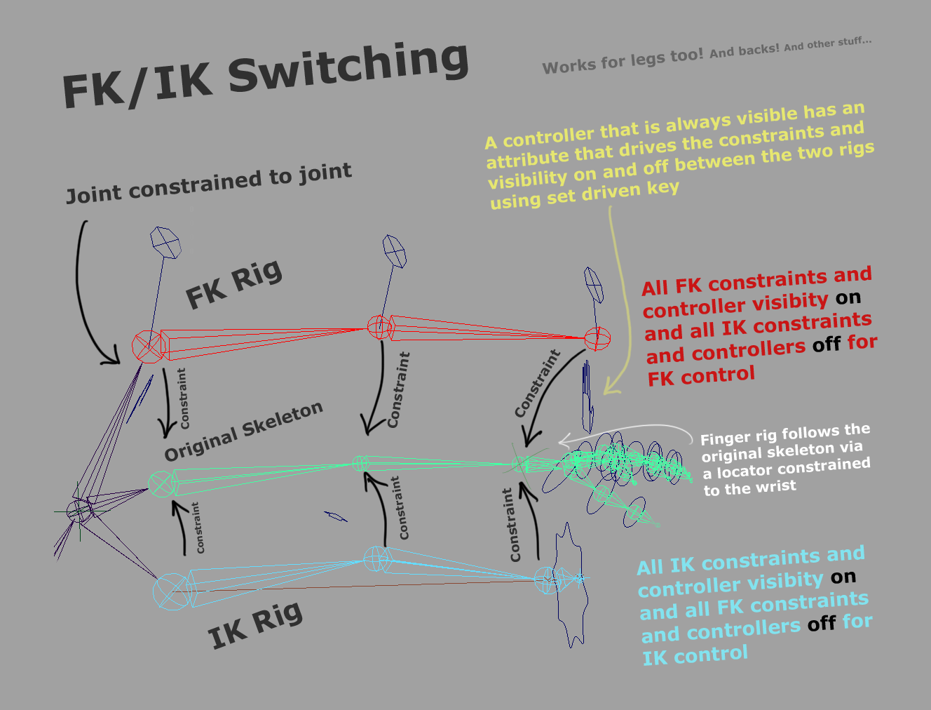 Inverse Kinematics and Forward Kinematics are two different setups for rigging controls that sound a lot more complicated than they really are. In a 3 point joint system, an FK setup would have a control handle constrained to every joint, so that each section can be moved separately. This allows precise control, but can be tedious for the animator to adjust for every set key. FK is generally used for arms, and can be setup to switch with IK when needed.