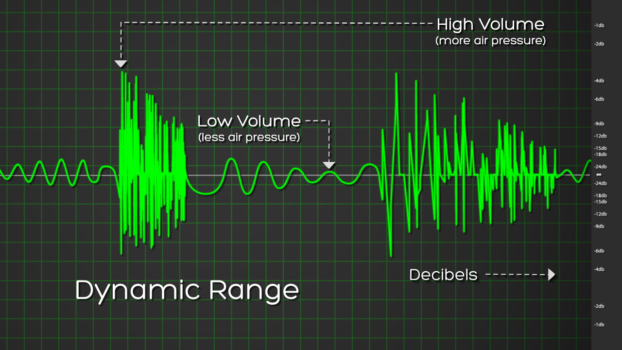 Dynamic Range refers to the difference between the maximum and minimum values, measured in decibels. Humans have a hearing range of about 140dB. Technology isn't organic, so it has less flexibility. 96-120 dB is the general range for audio with 16-24 bit depth. The minimum value is called the noise floor. It is not really possible for most audio equipment to exceed 129 dB of dynamic range. Distortion tends to occur the higher the dynamic range is.