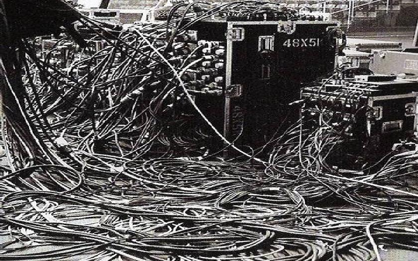Stage music generally consists of multiple sound sources: the band members and instruments. These sounds are passed through microphones and amplifiers, which are in turn connected to power outlets and a soundboard or mixer. The soundboard is designed to allow fine adjustment controls for each instrument seperately, so that volume can be raised for the bassist without affecting the volume of the lead singer. Cables running from the stage equipment are assigned separate input and output channels on the soundboard. The power cables are always kept separate from the audio cables to avoid blowing out the entire chain of connected equipment. It may seem unnecessarily complex, but all the weird cables serve a purpose of adding more control over the recording process.