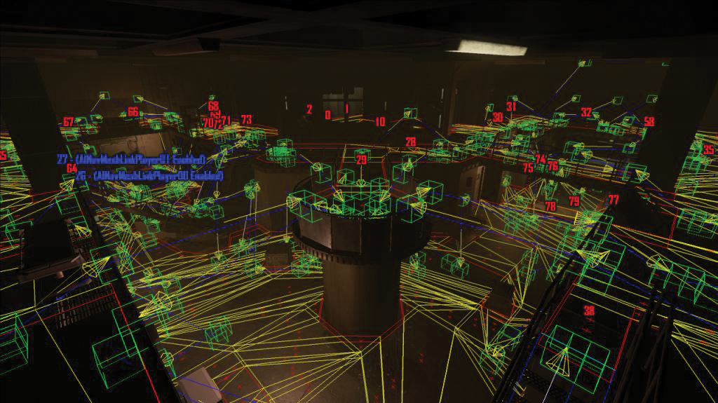 A navmesh lays out the paths that A.I. can traverse. A.I. tend to have an especially difficult time handling multilevel terrain with obstacles like rocks or columns. Navmesh algorithms can involve some rather complicated programming