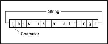A string is a set of characters. It can be broken down into substrings. length() will return the number of characters in the string. print can be invoked to display characters on screen.